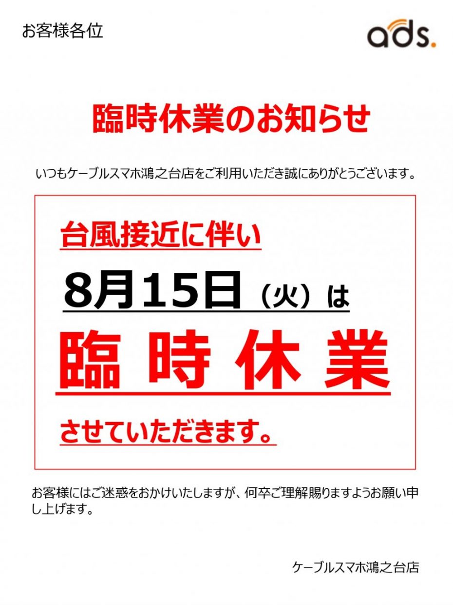 臨時休業のお知らせ
