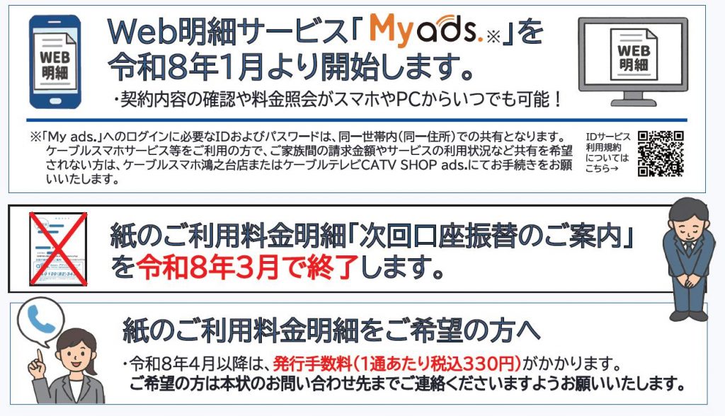 今後は、令和8年1月より開始予定のお客さま専用WEB明細サービス「My ads.(マイエーディーエス)」にて、ご利用料金の確認などが可能となります。サービスの詳細につきましては、令和8年1月以降、順次ご案内をお届けいたしますので、そちらをご確認くださいますようお願いいたします。